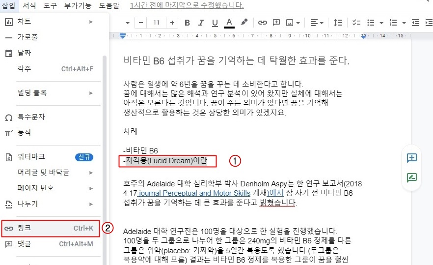 - ② 구글 문서 상단의 메뉴에서 삽입탭을 클릭 후 나오는 드롭다운 메뉴 하단 부근의 링크를 클릭하거나 바로가기 키 Ctrl+K를 누릅니다.