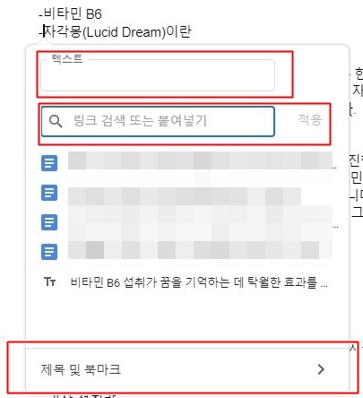 - 링크용 텍스트를 입력합니다. 텍스트를 블록화한 경우에는 링크용 텍스트 입력 박스가 안나오며 블록화된 텍스트가 링크 텍스트가 됩니다.