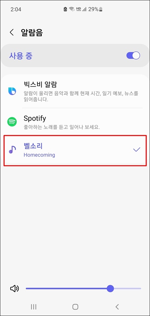 - 설정된 벨소리 목록에 열거되는 벨소리 중 마음에 드는 알람음를 선택합니다.