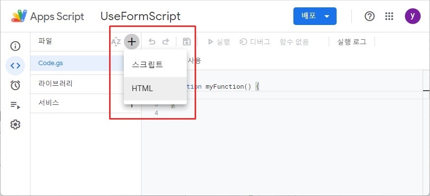 구글 스프레드시트에서의 사용자 정의 폼(Userform)은 구글 앱스 스크립트(Apps Script)에서 HTML 문서로 만들어 사용합니다.