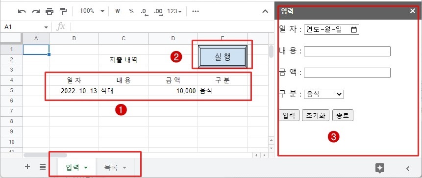 시트 문서의 실행 버튼을 클릭하면 지출 내역 입력 작업이 수행됩니다.