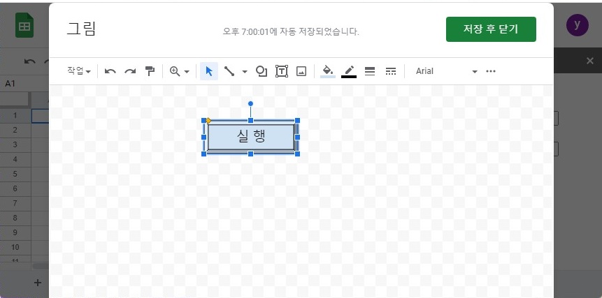 - 아래 캔버스로 드래그하여 도형을 생성하고 텍스트를 넣고 우측 상단 저장 후 닫기를 클릭하면 시트상 선택돼 있는 셀 부근에 도형이 삽입됩니다.