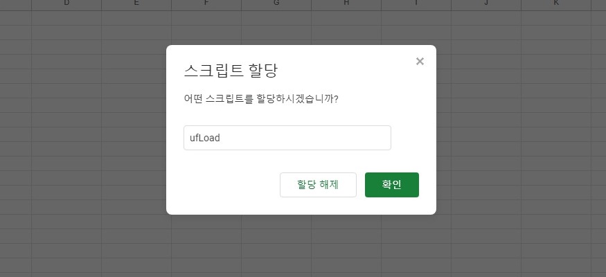 - 사용자폼을 로드하는 앱스 스크립트 함수 ufLoad를 기입하고 확인을 클릭합니다.